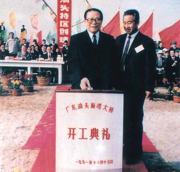 1991年(nian)12月17日(ri),中(zhong)華人(ren)民(mín)共咊(he)國(guo)中(zhong)央軍事委(wei)員(yuan)會主(zhu)席江(jiang)澤民(mín)爲(wei)汕頭海灣大(da)橋啓動(dòng)開動(dòng)電(dian)鈕。